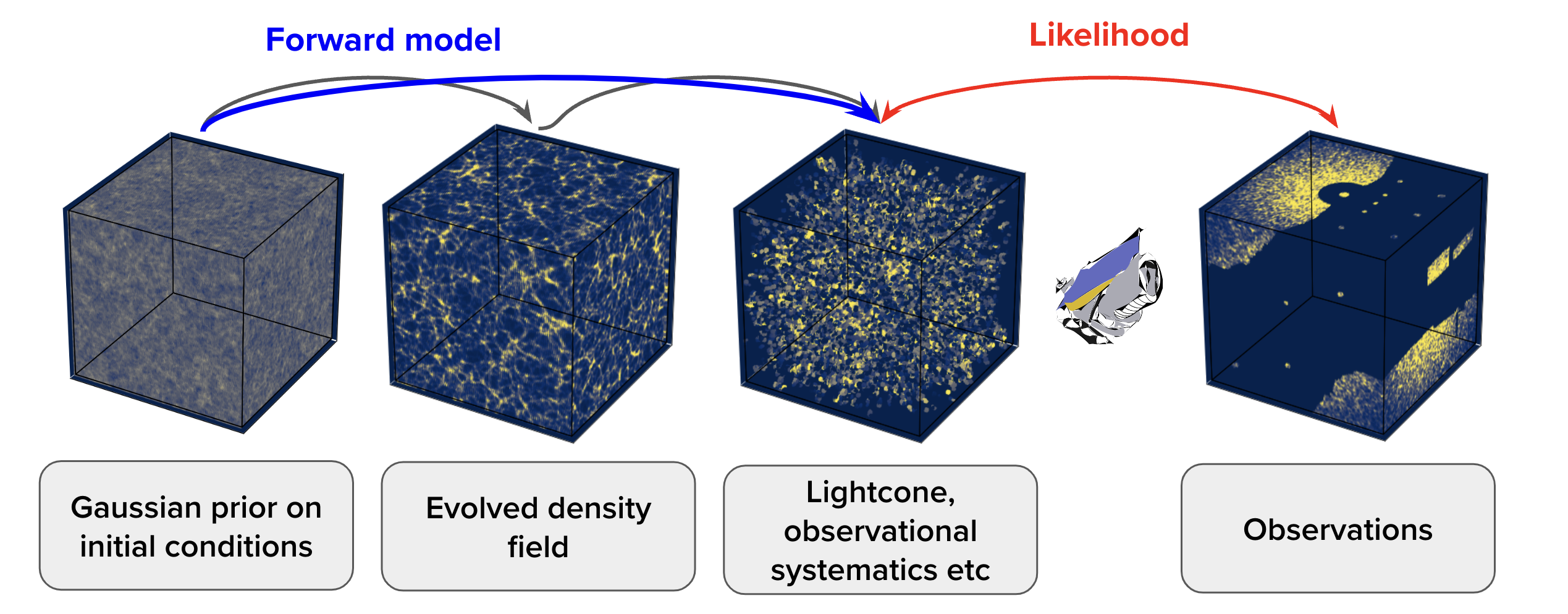 The incorporation of a neural network-based field-level emulator into the initial conditions inference framework BORG (Bayesian Origin Reconstruction from Galaxies; Jasche & Wandelt 2013, Jasche & Lavaux, 2019) to increase efficiency and accuracy in recovering non-linear structures. See Doeser et al. 2024 for details. Image credit below: D.K. Ramanah et al. (2019).