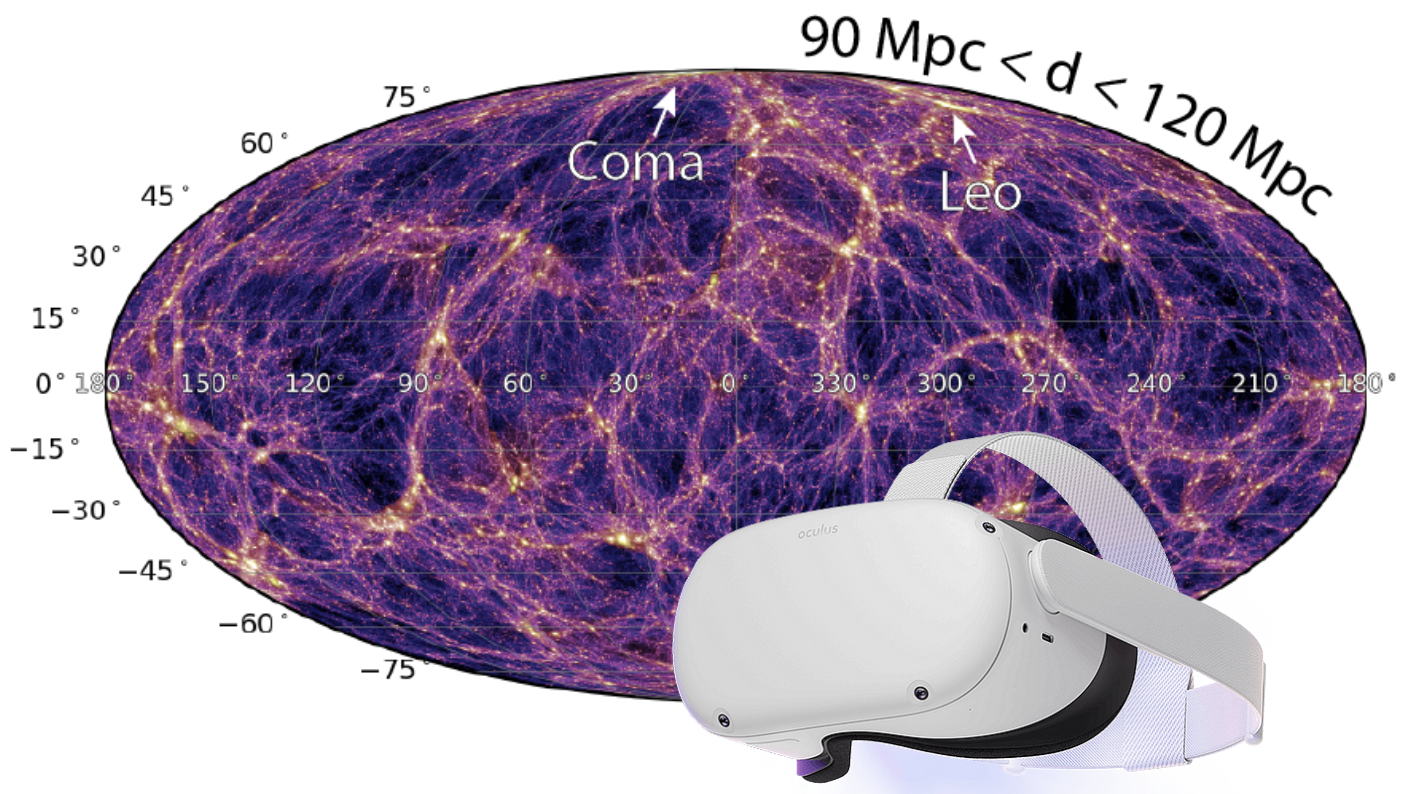 Recently, the Sibelius-dark project (McAlpine, S. et al, 2022) presented a high-resolution simulation of our local Universe. It was generated with a sophisticated N-body simulation with initial conditions generated by the BORG-algorithm taking the actual galaxy distribution in the sky as input. Thanks to lead author Dr. Stuart McAlpine (now a software engineer at Stockholm University) one can now fly around in this simulation using a VR-headset. If you're a school teacher, you can book a Fysikshow for free and we will bring the VR. Professor Carlos Frank at the Institute for Computational Cosmology, at Durham University, has said: